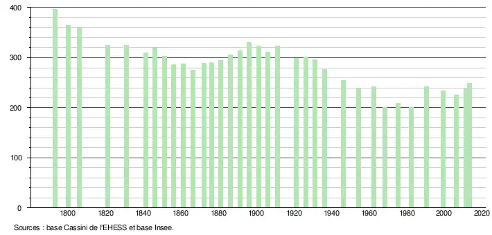 - ↑ Par convention dans Wikipédia, le principe a été retenu de n’afficher dans le tableau des recensements et le graphique, pour les populations légales postérieures à 1999, que les populations correspondant à une enquête exhaustive de recensement pour les communes de moins de 10 000 habitants, et que les populations des années 2006, 2011, 2016, etc. pour les communes de plus de 10 000 habitants, ainsi que la dernière population légale publiée par l’Insee pour l'ensemble des communes.