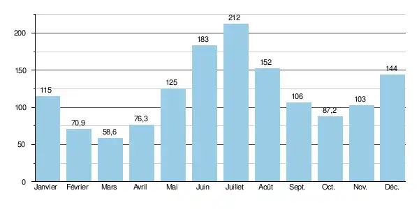 Le débit moyen mensuel observé en mars (minimum d'étiage) atteint 58,6 m3/s, soit un peu plus du quart du débit moyen du mois de juillet (212 m3/s), ce qui témoigne de l'amplitude déjà importante des variations saisonnières. Sur la durée d'observation de 12 ans, le débit mensuel maximal a été de 502 m3/s en .