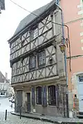 La façade principale de la maison est avec un pignon très élancé avec étages en encorbellement et pans de bois, au-dessus d'un rez-de-chaussée en pierre. Il semble que le rez-de-chaussée ait été refait au XVIe siècle, avec pilastres et corniche, frise ornée[1].