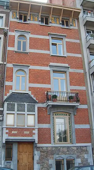 La façade est formée de deux travées et de cinq niveaux. Le soubassement de la maison est composé de grès vitrifié dans la masse et de pierres de taille. Le reste de l'immeuble est bâti en brique rouge mais entrecoupé à intervalles réguliers par six bandeaux de pierre bleue.
