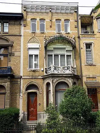La maison compte deux travées et trois niveaux (deux étages). La travée de gauche est la plus étroite. La façade est bâtie en brique jaune avec soubassement et encadrements de baies en pierre bleue. Au rez-de-chaussée, le bow-window compte trois baies en arc en plein cintre avec arc de décharge légèrement brisé. Des mosaïques dessinant des rubans ornent le haut du bow-window. Au-dessus de ce dernier, un balcon en pierre de taille laisse apparaître quatre ouvertures ornées de fers forgés plats aux courbes multiples et originales. La façade est signée par Jules Hofman au-dessus de la baie d'imposte de la porte d'entrée. Les baies du premier étage de la travée de droite sont surmontées par une marquise arrondie dont l'ossature forme des spirales d'où s'extraient une douzaine de roses en fer. Sous la marquise, se trouve une mosaïque représentant une figure de jeune fille entourée de roses blanches. Trois pilastres ponctuent le haut de la façade.
