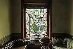 La fenêtre de cave grillagée (ferronnerie en éventail aux motifs végétaux) forme un arc outrepassé. La porte d'entrée en bois est ornée de vitraux reprenant des motifs végétaux stylisés sur les deux tiers supérieurs. Des vitraux occupent aussi la baie d'imposte. Un sgraffite à dessin végétal (dégradé en ) est placé au-dessus de cette baie d'imposte. Sur la travée de gauche, le bow-window présente une menuiserie ouvragée formant dans le bas des lignes courbes et des carreaux et utilisant des vitraux polychromes sur la partie principale. Un petit garde-fou en bois coiffe ce bow-window. La corniche, entrecoupée d'une baie rectangulaire, repose sur d'imposants modillons en biais doublés de traverses courbes.