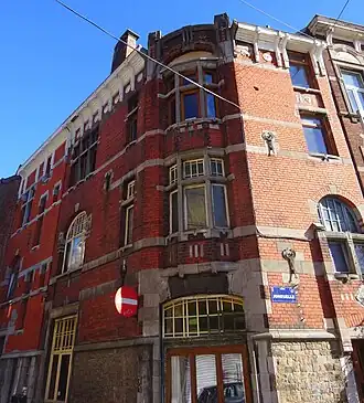 Cet immeuble d'angle comporte trois niveaux (deux étages) et quatre travées. Le soubassement est réalisé en moellons de grès à dominante grise surmontés d'un cordon mouluré en pierre calcaire. La partie principale des façades est élevée en briques interrompues par des cinq bandeaux en pierre calcaire. La travée d'angle comporte un oriel à trois pans s'étendant sur les deux étages. Cet oriel est surmonté par un arc en plein cintre situé entre deux pilastres à terminaison striée. Plusieurs ornements de style Art nouveau ponctuent les façades comme quatre ancres de façade aux formes arrondies ou différents carrés et rectangles ainsi que neuf cercles placés entre les modillons de la corniche[1].