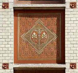 Cette polychromie est renforcée par la présence de sgraffites à dominante orange et d'éléments ornementaux en terre cuite, par la couleur brune des châssis de fenêtres et par la couleur grise de l'oriel et de la corniche.