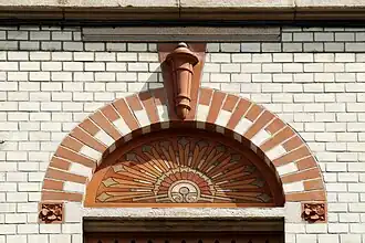 La caractéristique la plus marquante de la façade est la polychromie qui résulte de la combinaison de plusieurs matériaux : la brique blanche vernissée, la brique rouge des claveaux et la pierre bleue du soubassement.