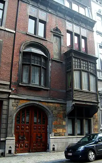 Parmi les éléments les plus significatifs de cette demeure, la porte d'entrée, en réalité une splendide porte cochère à deux battants en bois sculpté de sphères et de rectangles, laisse la place dans sa partie supérieure à des vitraux américains sous un arc légèrement brisé. Des boîtes aux lettres en fer forgé très ouvragé ornent cette porte et, au sol, deux sympathiques petits monstres s'appuient sur chaque pied-droit. On retrouve ces petits monstres faisant fonction d'ancres de façade sur la maison Moonen réalisée un an plus tard par Victor Rogister.