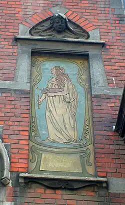 Entre le premier et le second étage, au centre de la façade, un sgraffite, représentation d'une femme drapée en train de peindre, est surmonté d'une sculpture en pierre d'une tête féminine aux cheveux longs stylisés. La partie inférieure de ce sgraffite reprend le nom du propriétaire : la restauration de 2022 a fait réapparaitre l'inscription "J Alexandre peintures et décors".
