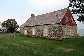 Arrière de la maison Leclerc avec le fleuve Saint-Laurent en arrière-plan.
