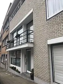 Le revêtement de la façade est fait de briques "à la main" émaillées blanches, caractéristiques des années 1950[4]. Les menuiseries sont en Teck et étaient peintes en blanc et acajou à l'origine[5]. On trouve dans la fenêtre de la cuisine au premier étage à droite, un châssis type "perspective" et persienne incorporée avec un double vitrage. La porte du garage était d'origine, peinte en jaune citron, aujourd'hui repeinte en blanc. Le garde-corps du balcon n'est plus vitré mais en profilé métallique.