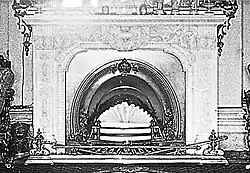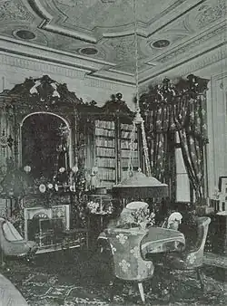 Quant au mobilier, l'entreprise responsable n'est aussi pas connue. Par contre, il est fort probable que Hugh Allan ait commandé son mobilier à l'entreprise J. & W. Hilton de Montréal. En plus d'avoir réalisé en 1867 le mobilier de l'édifice de la Banque des Marchands[46], Hugh Allan a déjà passé au moins deux commandes à cette entreprise par le passé, soient l'ameublement complet de la bibliothèque en 1863[b 2], puis d'un ensemble complet de chambre à coucher en 1867[49]. Ainsi, les galeries de rideaux recouverts de feuilles d'or (les «gilt cornices» dont fait référence un article paru le 22 novembre 1872[45]) et leurs rideaux proviendraient de cette entreprise selon un dessin de Robert Williams[50], de même que les fauteuils, canapés ou les grands miroirs installés dans les niches[45],[51].