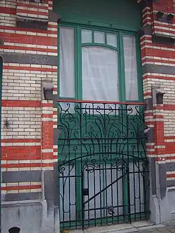 La travée droite possède un rez-de-chaussée d'une hauteur inhabituelle car celui-ci comprend une fenêtre de cave sous la baie principale. Au niveau supérieur, un imposant bow-window occupe la totalité de la travée. Au dernier niveau mansardé, deux arcs-boutants en brique entourent une lucarne et deux pilastres. Des grilles en fer forgé en coup de fouet protègent les baies superposées du rez-de-chaussée et constituent un balcon devant la lucarne au dernier niveau.
