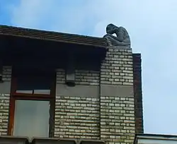 Les derniers étages se composent de séries de quatre baies surmontées d'une étrange corniche en béton strié créant un surplomb en son centre. Sur chaque petit pilastre latéral, on peut observer un singe assis, les mains sur les genoux semblant regarder son vis-à-vis. Ces sculptures ont été réalisées par Oscar Berchmans.