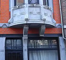 Le second étage comprend un balcon en ferronnerie protégeant une baie en triplet ornée de petits bois et latéralement surmontée de denticules. Une corniche centrale arrondie et proéminente coiffe la façade alors que deux petites corniches latérales sont placées plus bas à la hauteur du balcon[2].