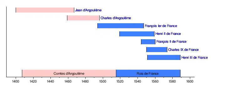 Le rameau cadet d'Angoulême règne sur le royaume de France de 1515 à 1589, année marquant la disparition de la lignée mâle et légitime consécutivement à l'assassinat du roi Henri III.