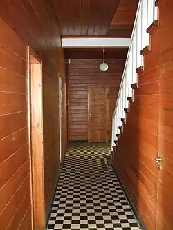 Les cloisons du rez-de-chaussée sont faites d'un bois relativement sombre, affectant une teinte rouge foncé, que l'on retrouve au sous-sol. L'ordonnance des pièces est spartiate, même s'il est vrai que l'ameublement d'origine a été perdu. La maison frappe par ses grandes portes-fenêtres blanches. Hormis le séjour, les pièces sont petites, mais fonctionnelles grâce aux armoires encastrées dans les cloisons et aux sanitaires individuels. La chambre d'Einstein au rez-de-chaussée lui servait aussi de cabinet de travail : le lit était encastré dans une niche de la cloison, il n'y avait qu'une table et une chaise droite, d'où le savant avait vue sur le village et les lacs de Havel ; enfin une solide console de bois posée à mi-hauteur pour ses livres. Les chambres à l'étage étaient celles de ses deux belles-filles et de la domestique.