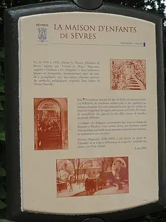 La Maison d'enfants de Sèvres fut fondée en 1941 par Yvonne et Roger Hagnauer dans une grande propriété[1] sans style qui, jusqu'à la guerre, abrita une communauté religieuse. Sous l’égide du Secours national (Entraide française), elle était, à l'origine, destinée à héberger des enfants de la région parisienne victimes des restrictions alimentaires. Mais elle a évolué sous l’influence de sa directrice, Yvonne Hagnauer (« Goéland »), en refuge pour les enfants victimes de la guerre et des persécutions politiques.