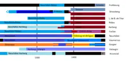 Quelques années après avoir donné ses franchises à la ville de Neuchâtel, en 1214, Ulrich III de Neuchâtel-Nidau et Berthold se partagent leur patrimoine. Le dernier demeure seigneur de Neuchâtel et des terres suisses romandes tandis qu'Ulrich se garde les terres suisses allemandes et le titre de comte de Neuchâtel. Ce partage intervient après le décès, le , du dernier représentant de la maison de Zähringen le duc Berthold V de Zähringen, alors recteur de Bourgogne. Avec l'extinction de cette maison, les droits qui s'attachaient à leur titre reviennent de fait à l'empereur germanique Frédéric II et à son fils Henri II de Souabe, ce qui implique que tous les dynastes qui avaient été soumis à Berthold V de Zähringen se voient dorénavant dépendants immédiats de l'empire germanique. Ulrich III va se réserver un ensemble de possessions de culture principalement suisse allemande, tout en se faisant confirmer son titre de comte de Neuchâtel[13]. Ce début du XIIIe siècle est aussi celui de l'apparition des différentes branches des Neuchâtel par le partage qu'effectue Ulrich III entre ses fils : les Nidau, les Strassberg et les Aarberg.