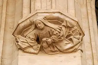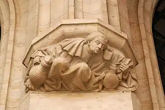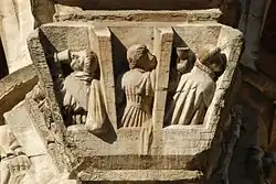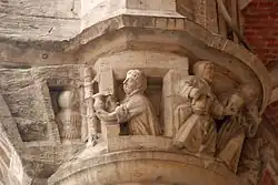 La limite entre la « Maison de la Cave aux Moines » et ses voisines, la « Maison de l'Estrapade » à gauche et la « Maison du Maure » à droite, est marquée par deux culs-de-lampe humoristiques où sont représentés, d'un côté, une dispute entre un bourgeois et un moine, et de l'autre, un moine et un maure consultant un livre.