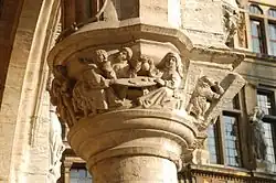 Ces deux arcades reposent sur deux piliers carrés et sur une colonne ronde surmontée d'un beau chapiteau figurant des moines en train de boire à table ou dans leur cellier. Selon Georges H. Dumont, « l'occasion était belle pour les sculpteurs d'évoquer les légendes et dictons du pays brabançon mais aussi de se moquer des travers de la société. Ceux du clergé, tout particulièrement. L’intention satirique est évidente sur ce chapiteau de l'aile droite, qui nous montre des moines attablés, buvant et mangeant joyeusement. »[2].