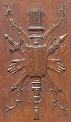 Sur les côtés de ce groupe sculpté, dans la partie supérieure des pilastres qui soutiennent le balcon, on aperçoit l'écusson du serment des Archers avec ses cinq croix d'inégale grandeur[3].