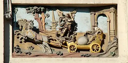 L'allège centrale du second étage est ornée d'un bas-relief représentant un char doré conduit par l'archange saint Michel entouré des représentations du Temps et de l'Espace[1].