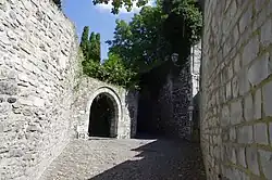 Le long de la rue des Frères-Mineurs, le haut mur en pierre calcaire est percé d'un porche cintré donnant un accès vers la façade arrière du corps de logis.