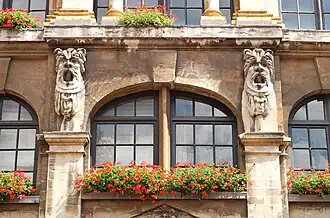 Les travées du premier étage sont percées de baies à arc surbaissé et sont délimitées par des masques de grotesques.