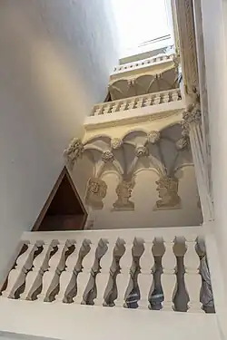 L'escalier : Il occupe une place de choix dans la demeure au cœur de l'hôtel particulier et permet l'accès aux étages. Il est richement orné de nombreux ornements en gypserie : colonnes de style gréco-romain, atlantes, putti, chimères, grotesques... et arbore d'élégants balustres à doubles poires en plâtre.