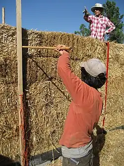 En fonction des ossatures construites, les bottes sont introduites de différentes manières : elles peuvent être mises en place légèrement en force entre des montants verticaux d'ossature et maintenues par des liteaux horizontaux. Selon les cas les montants sont positionnés au centre, du côté intérieur ou extérieur des parois? L'Éco-hameau à Saint-Laurent-en-Beaumont, en Isère (France)[6] est construit de cette manière. Les bottes peuvent aussi être positionnées sans contraintes dans un couloir formé par une double ossature (type GREB) et sont maintenues par des tirants métalliques, comme au bâtiment agricole de l'AMAP de La Riche, en Indre-et-Loire (France)[7].