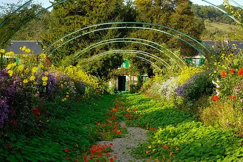 La maison où vit Claude Monet de 1883 à 1926 est réaménagée par ses soins : gardant le crépi rose, il la repeint aux couleurs de sa palette : portes et volets verts ; salle à manger jaune de chrome vif, ornée d'estampes japonaises des XVIIIe et XIXe siècles à la dominante bleue, cuisine avec ses murs carrelés de faïence bleu et blanc en céramique de Rouen, et ses meubles laqués bleu ciel. De même pour le jardin, il fait détourner un bras de l'Epte pour alimenter un étang franchi par le pont japonais. Collectionneur de revues horticoles, il se montre perfectionniste pour son jardin : engageant jusqu'à sept jardiniers, dont l'un est chargé quotidiennement d'enlever les gouttes de pluie ou de rosée sur les nénuphars[1].
