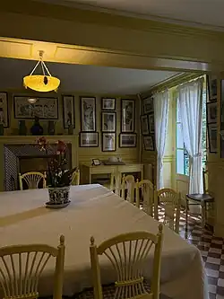 • au rez-de-chaussée : le « petit salon bleu » (salon de lecture), l'épicerie (entrepôt), le salon-atelier, la salle-à-manger (sur les murs, la collection d’estampes japonaises) et la cuisine (aux carreaux bleus de Rouen, une immense cuisinière et des ustensiles de cuivre) ;