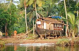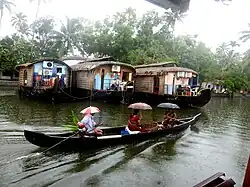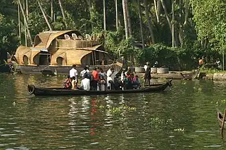 Un kettuvallam dans les backwaters du Kerala, au sud-ouest de l'Inde. Initialement utilisés comme cargo, ils ont été convertis en navire de plaisance.