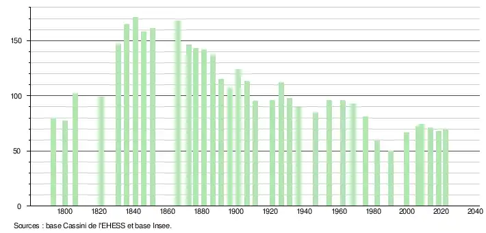 L'évolution du nombre d'habitants est connue à travers les recensements de la population effectués dans la commune depuis 1793. Pour les communes de moins de 10 000 habitants, une enquête de recensement portant sur toute la population est réalisée tous les cinq ans, les populations de référence des années intermédiaires étant quant à elles estimées par interpolation ou extrapolation[23]. Pour la commune, le premier recensement exhaustif entrant dans le cadre du nouveau dispositif a été réalisé en 2008[24].