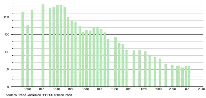 L'évolution du nombre d'habitants est connue à travers les recensements de la population effectués dans la commune depuis 1793. Pour les communes de moins de 10 000 habitants, une enquête de recensement portant sur toute la population est réalisée tous les cinq ans, les populations de référence des années intermédiaires étant quant à elles estimées par interpolation ou extrapolation[15]. Pour la commune, le premier recensement exhaustif entrant dans le cadre du nouveau dispositif a été réalisé en 2008[16].