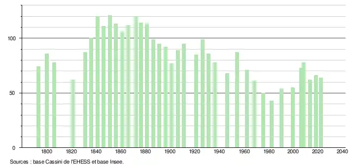 L'évolution du nombre d'habitants est connue à travers les recensements de la population effectués dans la commune depuis 1793. Pour les communes de moins de 10 000 habitants, une enquête de recensement portant sur toute la population est réalisée tous les cinq ans, les populations de référence des années intermédiaires étant quant à elles estimées par interpolation ou extrapolation[15]. Pour la commune, le premier recensement exhaustif entrant dans le cadre du nouveau dispositif a été réalisé en 2008[16].