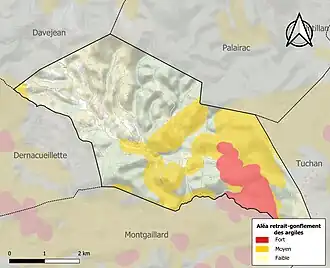 Le retrait-gonflement des sols argileux est susceptible d'engendrer des dommages importants aux bâtiments en cas d’alternance de périodes de sécheresse et de pluie. 36,8 % de la superficie communale est en aléa moyen ou fort (75,2 % au niveau départemental et 48,5 % au niveau national). Sur les 79 bâtiments dénombrés sur la commune en 2019, 71 sont en aléa moyen ou fort, soit 90 %, à comparer aux 94 % au niveau départemental et 54 % au niveau national. Une cartographie de l'exposition du territoire national au retrait gonflement des sols argileux est disponible sur le site du BRGM[24],[Carte 3].