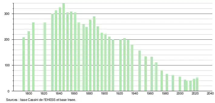L'évolution du nombre d'habitants est connue à travers les recensements de la population effectués dans la commune depuis 1793. Pour les communes de moins de 10 000 habitants, une enquête de recensement portant sur toute la population est réalisée tous les cinq ans, les populations de référence des années intermédiaires étant quant à elles estimées par interpolation ou extrapolation[29]. Pour la commune, le premier recensement exhaustif entrant dans le cadre du nouveau dispositif a été réalisé en 2008[30].