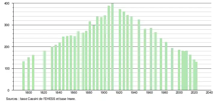 L'évolution du nombre d'habitants est connue à travers les recensements de la population effectués dans la commune depuis 1793. Pour les communes de moins de 10 000 habitants, une enquête de recensement portant sur toute la population est réalisée tous les cinq ans, les populations de référence des années intermédiaires étant quant à elles estimées par interpolation ou extrapolation[24]. Pour la commune, le premier recensement exhaustif entrant dans le cadre du nouveau dispositif a été réalisé en 2004[25].