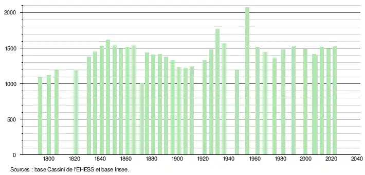 L'évolution du nombre d'habitants est connue à travers les recensements de la population effectués dans la commune depuis 1793. Pour les communes de moins de 10 000 habitants, une enquête de recensement portant sur toute la population est réalisée tous les cinq ans, les populations de référence des années intermédiaires étant quant à elles estimées par interpolation ou extrapolation[16]. Pour la commune, le premier recensement exhaustif entrant dans le cadre du nouveau dispositif a été réalisé en 2007[17].