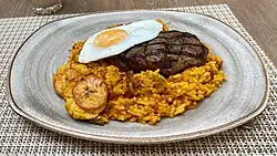 | Ingrédients | Riz, charqui, œuf et plantain frit |
