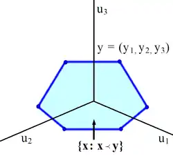 La figure 1 montre l'enveloppe convexe, en bleu, pour le vecteur y = (3, 1) ; c'est le segment de droite joignant (3, 1) à (1, 3). Parmi tous les vecteurs x sur ce segment, celui pour lequel la première composante de est la plus petite est le vecteur x = (2, 2). La figure 2 montre une enveloppe convexe en 3D, qui est ici un polygone plan. Son centre est le « plus petit » vecteur x tel que . - On a x = Ay pour une matrice bistochastique A[4].