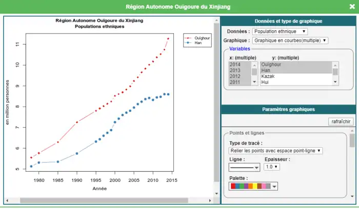 L’atlas propose six types de représentation graphique des données statistiques : graphique en courbes, nuages de points, graphique à barres, diagramme en secteurs, boîtes à moustaches et diagramme de points. Les variables statistiques changent de façon dynamique en fonction des divisions administratives. Les paramètres graphiques sont également personnalisables.