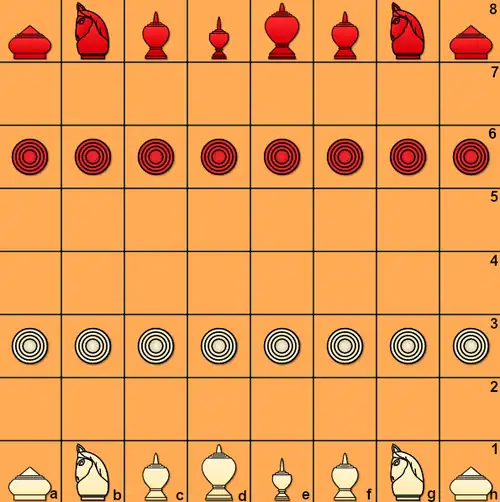 - Les pions (เบี้ย Bia) sont situés en troisième ligne, ils avancent et prennent de façon classique. Contrairement aux échecs modernes, ils n'ont pas droit à un double pas lors de leur déplacement initial. Leur promotion en Met se fait lorsqu'ils atteignent la sixième ligne (position de départ des pions adverses).