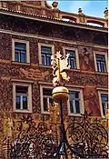 Cette petite place entièrement piétonne est entourée de façades colorées. Au centre se trouve un puits de 1560, orné d'une grille Renaissance et surmonté d'un lion de Bohême doré. La Maison Rott, de style néo-Renaissance, date de 1890 et arbore une façade peinte qui s'inspire de la technique des sgraffites utilisée pour décorer les façades des bâtiments Renaissance.