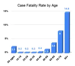 La mortalité concerne principalement les personnes âgées, l'âge moyen des décès dus à la Covid-19 étant de 81 ans au début de l'épidémie, et les personnes présentant des comorbidités (diabète, obésité, etc.). Le taux de létalité, initialement estimé à environ 0,5 % en moyenne, varie de 0,01 % pour les moins de 15 ans à 17,4 % pour les plus de 90 ans[5].