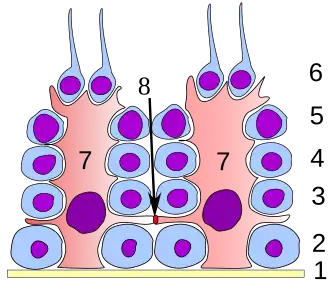 L'ACE2 est une enzyme de conversion des récepteurs cellulaires de l'angiotensine II[68]. Elle est présente sur les « cellules épithéliales alvéolaires AT2 » situées dans les alvéoles pulmonaires, mais aussi dans l'œsophage (dans les cellules épithéliales supérieures et stratifiées), dans les entérocytes absorbants de l'iléon et du côlon[68],[69] et dans le pancréas (de légères pancréatites sont d'ailleurs observées, via analyses d'amylase et de lipase et via l'imagerie médicale, chez les malades légèrement ou sévèrement atteints par la Covid-19[69]). Les « cellules à AT2 » sont connues pour être sujettes aux infections virales[70].