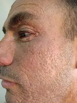 Les symptômes de la maladie varient grandement selon les individus. Ils peuvent inclure une voix rauque, des lésions et des cicatrices sur la peau, une peau facilement endommagée avec une mauvaise cicatrisation, une peau sèche et ridée et un perlage des papules autour des paupières[3],[4],[5]. Dans certains cas, on observe également un durcissement du tissu cérébral dans les lobes temporaux médians, ce qui peut entraîner de l'épilepsie et des anomalies neuropsychiatriques[6].