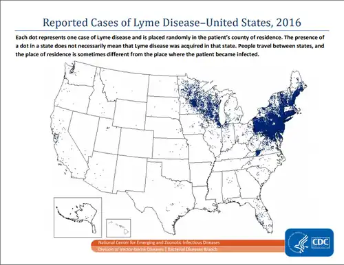 - aux États-Unis, la tique Ixodes scapularis transmet souvent aussi Anaplasma phagocytophilum (agent de l'ehrlichiose humaine), et moins fréquemment Babesia microti (agent de la babésiose), Borrelia miyamotoi, Borrelia mayonii (agents de fièvres récurrentes à tiques)[32],[33] ;