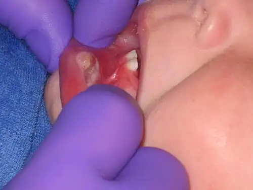 La plupart du temps, la maladie de Riga-Fede est liée à l’émergence, éventuellement anormalement précoce, de dents natales-néonatales chez les nouveau-nés[5] ou à l’incisive inférieure primaire chez les nourrissons plus âgés[6].