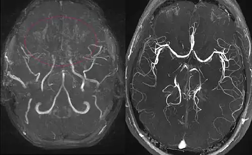 En réaction à cette occlusion se développe un réseau vasculaire anormal au niveau de la base du crâne, dont l’aspect angiographique en « nuage de fumée » (en japonais : もやもや, moyamoya) a donné son nom à la maladie.